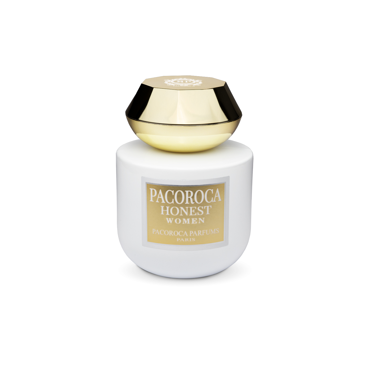 بطری Pacoroca Honest Women با طراحی زیبا و مدرن، بدنهای به رنگ سفید مات دارد که با لیبل طلایی ترکیب شده است. درپوش طلایی و براق این عطر، جلوهای شیک و لاکچری به آن بخشیده است و حس خاص بودن را به همراه دارد.